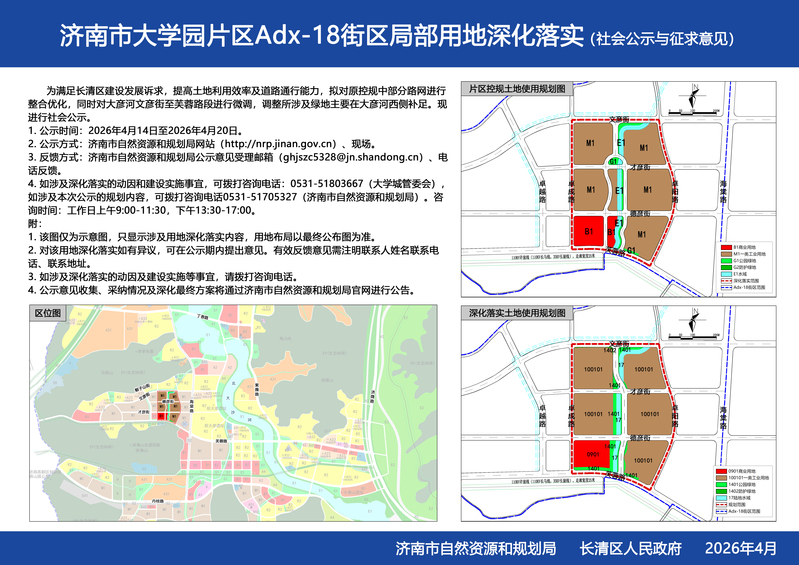 济南市大学园片区Adx-18街区局部用地深化落实(社会公示与征求意见)于2026年4月14日至2026年4月20日在济南市自然资源和规划局网站、现场进行社会公示与征求意见,具体内容登录济南市自然资源和规划局网站http://nrp.jinan.gov.cn/details/HJO76Qon-l.html。