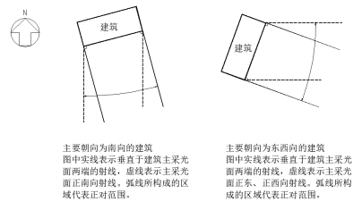 (八)正对范围是指垂直于建筑主要朝向采光面两端的射线以及主要朝向采光面范围内正南向(或正东、西向)所构成的区域,位于该区域的建筑,按照正向间距的有关要求对待;位于该区域之外的建筑,按照侧向间距的有关要求对待。