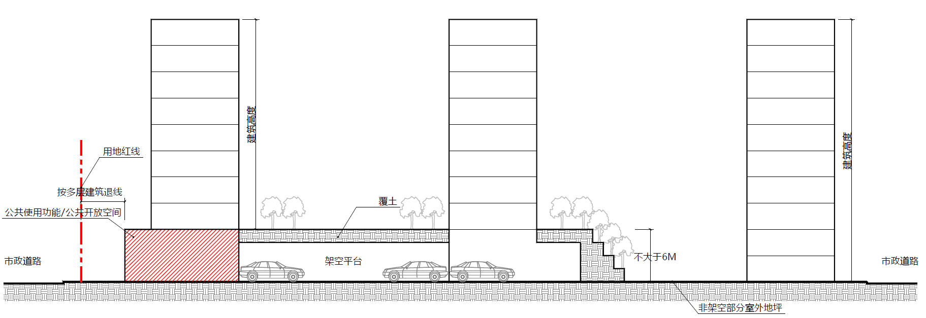 3.架空平台应按多层建筑退线,并处理好与周边四邻的界面关系。