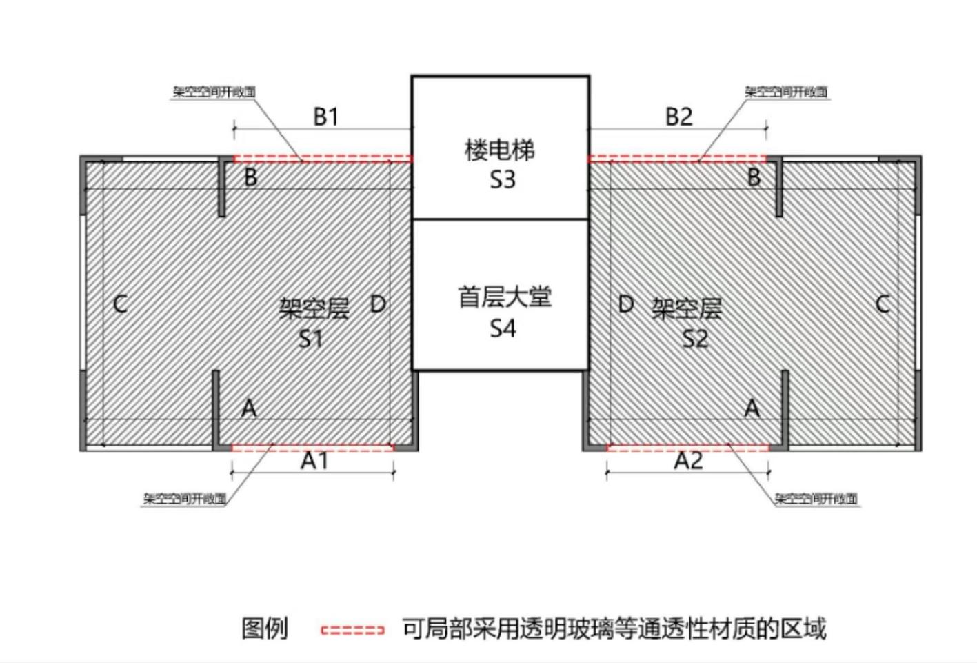 架空开敞面累计长度应不小于架空空间周长的40%,即A1+B1+A2+B2≥(A+B+C+D)×2×40%。