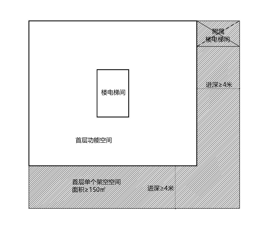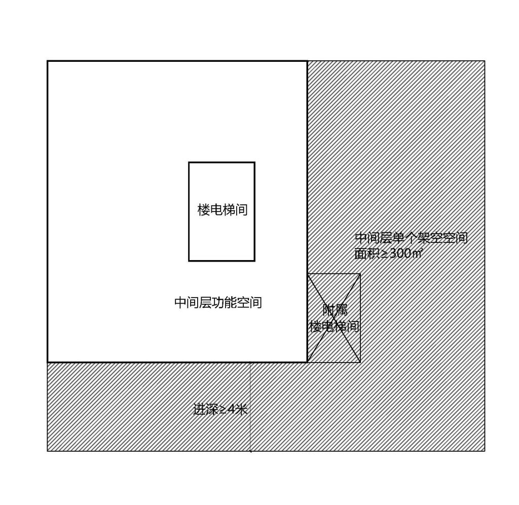 非住宅建筑位于塔楼中间层的单个架空空间面积应不少于 300平方米,其临开敞面进深应不小于4米。