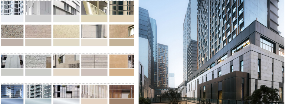 居住区的建筑色彩,营造淡雅平和、亲切轻松的居住氛围。不建议大面积深色色调或大面积鲜艳色调。色彩选择上更为开放,塑造丰富多彩的城市形象。门窗可采用部分特有色彩加以点缀。