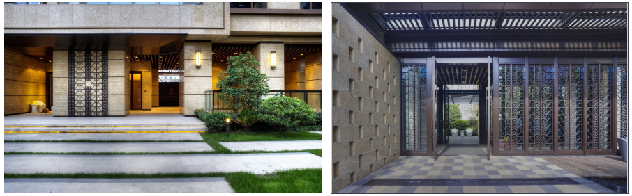 建筑底部在材料、色彩上与建筑整体立面相协调,在细节、材质肌理、尺度等方面应重视人的感受,近人部分的处理应丰富、细腻。