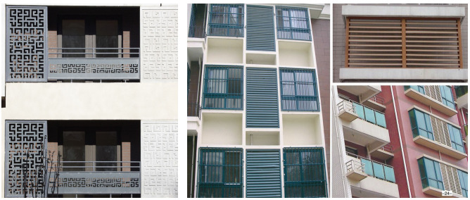 设于外窗的空调机位宜位于外窗两侧,不宜位于外窗下部,避免管线暴露,破坏立面效果。空调百叶宜采用可开启方式,便于后期安装维护。百叶间距不应过密,以利通风散热。不宜使用金属栏杆等易锈蚀的构件。