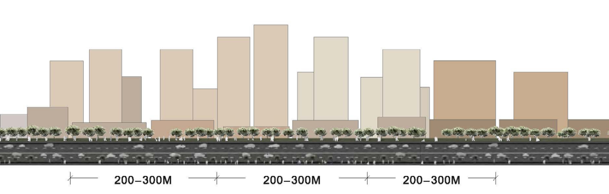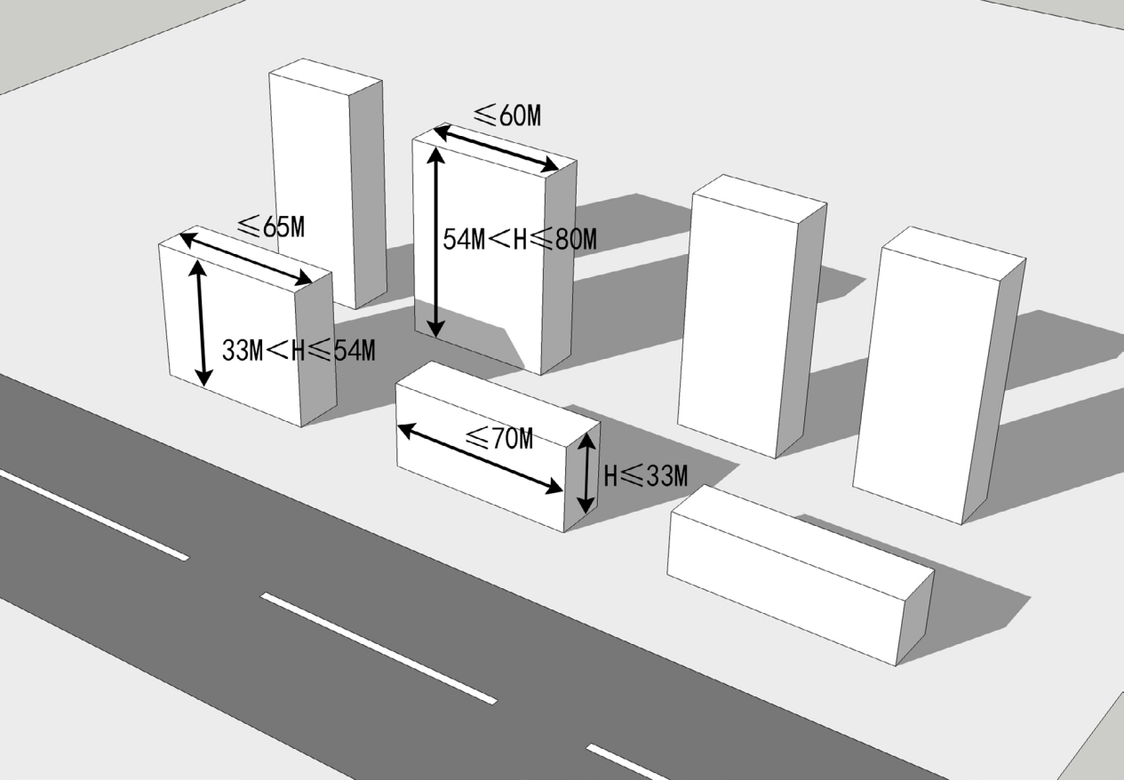 城市重要干道两侧的居住建筑,H≤33米,最大连续展开面宽不宜大于70米;33米<H≤54米,最大连续展开面宽不宜大于65米;54<H≤80米,最大连续展开面宽不宜大于60米。