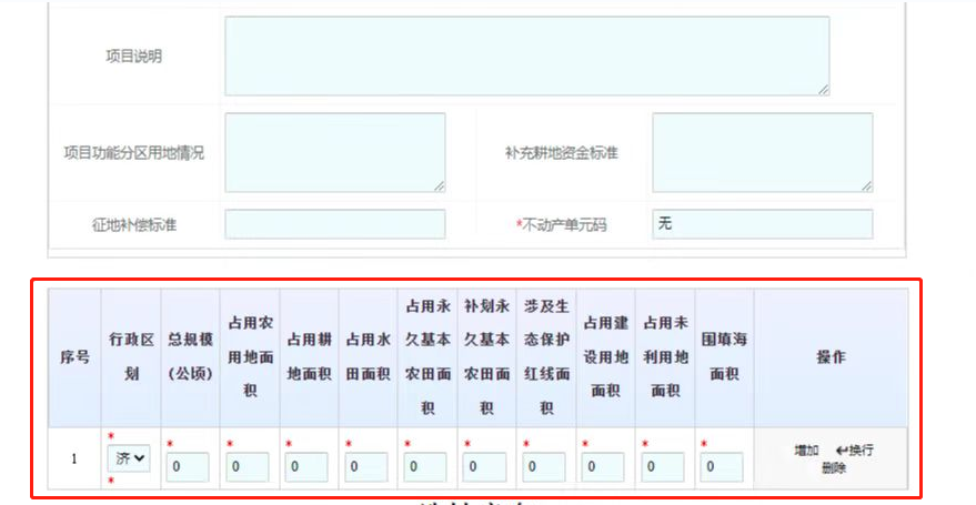 增加拟用地规模占地情况,该内容需按照行政区划分别进行填写。如项目建设用地涉及多个区县,则需点击“增加”按钮,分别填写项目所在行政区划的各类占地面积。如图(一)所示。