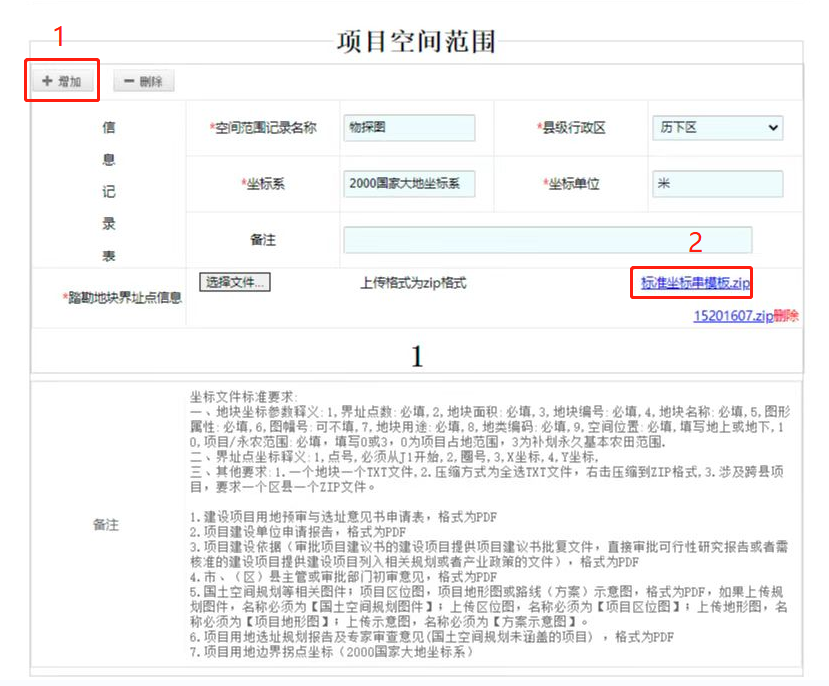 增加项目空间范围,该内容需按照行政区划分别进行填写。如项目建设用地涉及多个区县,则需点击“增加”按钮,生成多个项目空间范围。需要注意的是:如果项目建设用地涉及多个行政区划的,分别在踏勘地块界址点信息上传项目所在区划的坐标数据。坐标数据上传要求详见坐标数据要求说明。如图(二)所示。