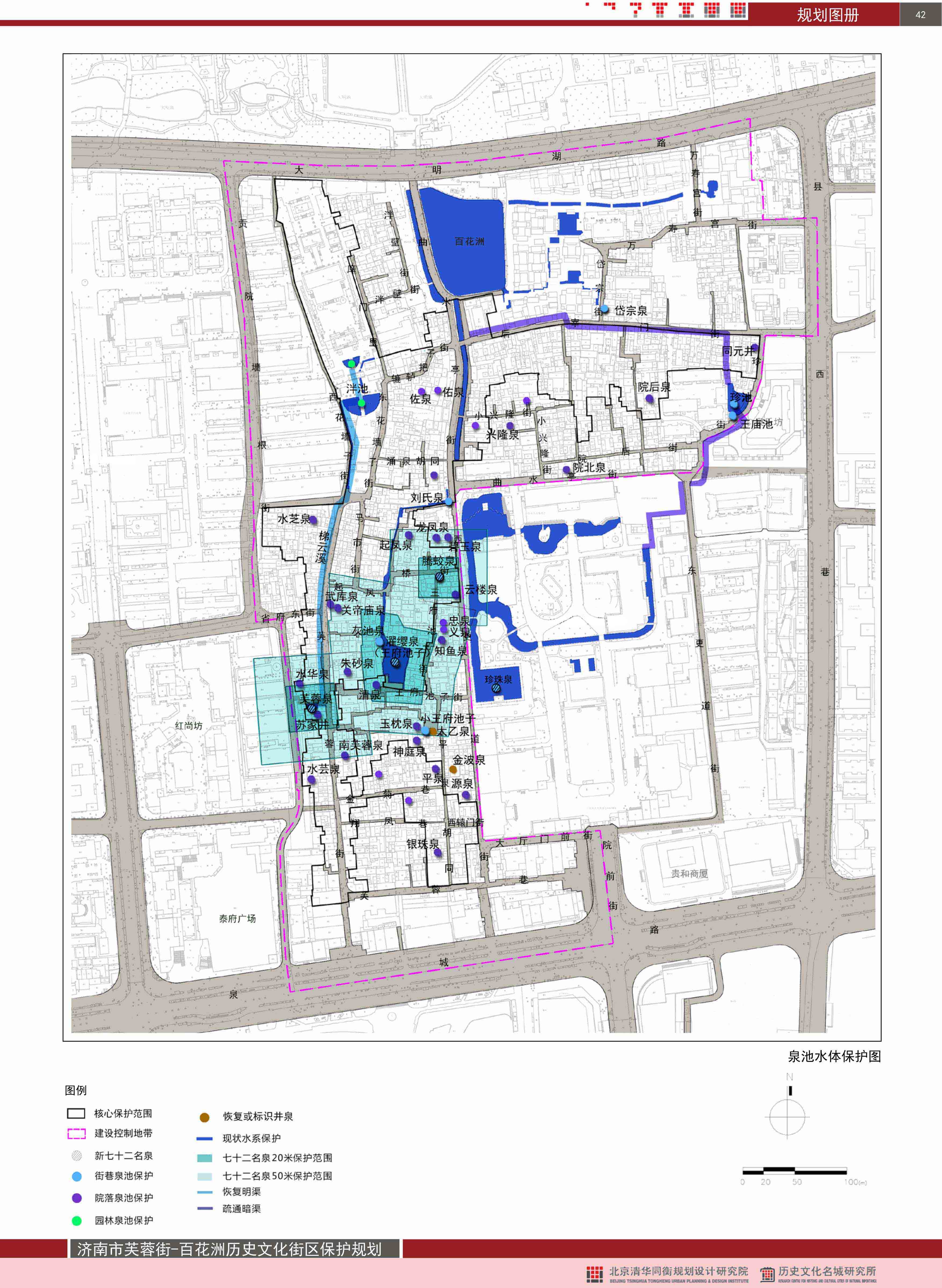 街区泉池水体的保护要与济南市泉城申遗相结合。街区内所有建设活动均要进行地下泉水泉脉的勘探工作,确定保泉深度,以泉池水体的保护为前提。