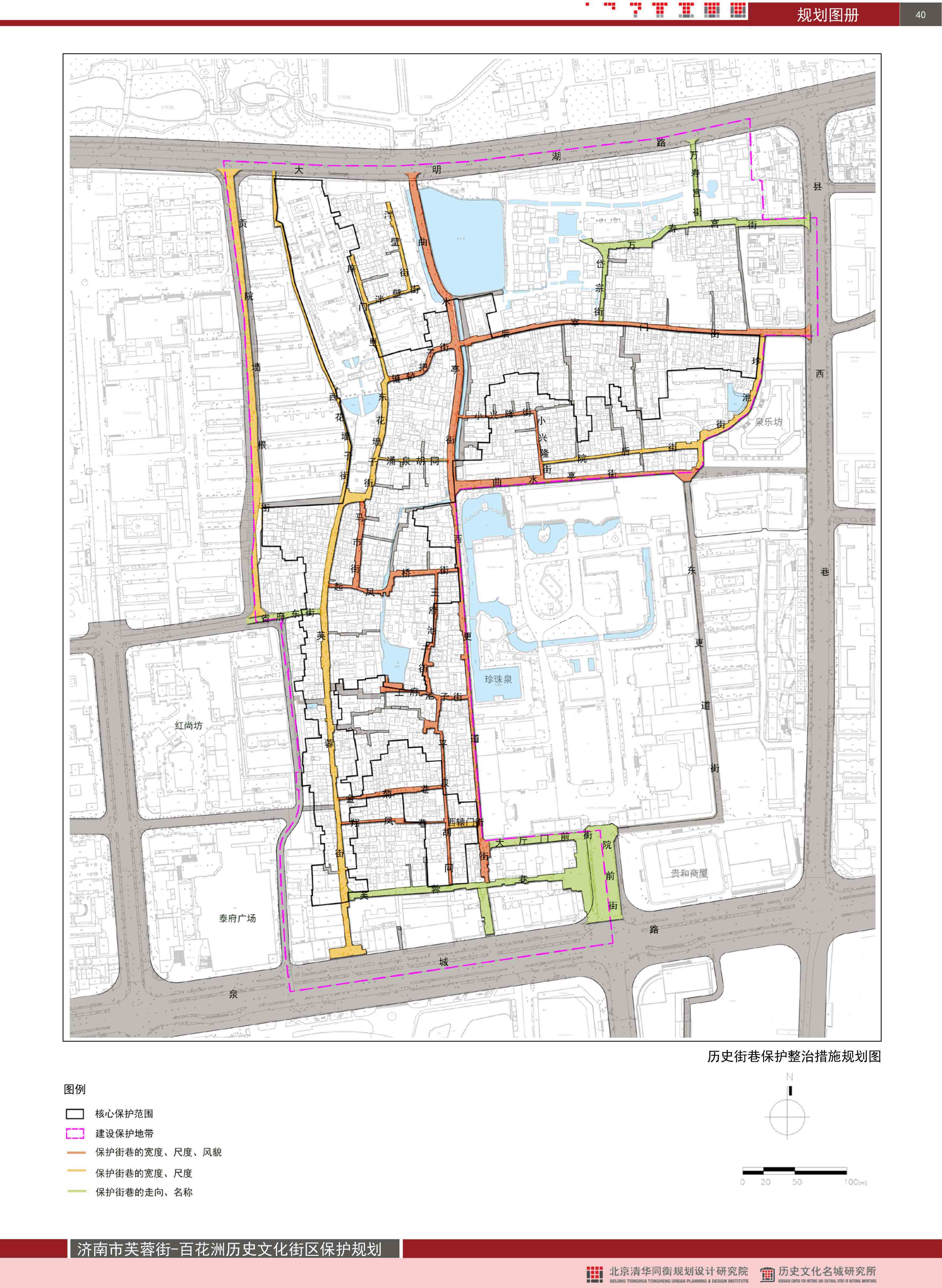 保护街区内部及其周围整体风貌,重点保护曲水亭街与曲水河,芙蓉街与梯云溪等南北向水巷构成的“街因泉走、水街共生”的传统空间格局。保护“家家泉水,户户垂杨”人泉共生、紧密相依的传统格局及文化风貌。严格控制府学文庙、百花洲、王府池子、珍珠泉群等重要节点周边的建筑风貌、高度与体量。严格控制街区核心保护范围内现状以一到两层为主的整体高度及由街巷和院落构成的城市肌理格局。
