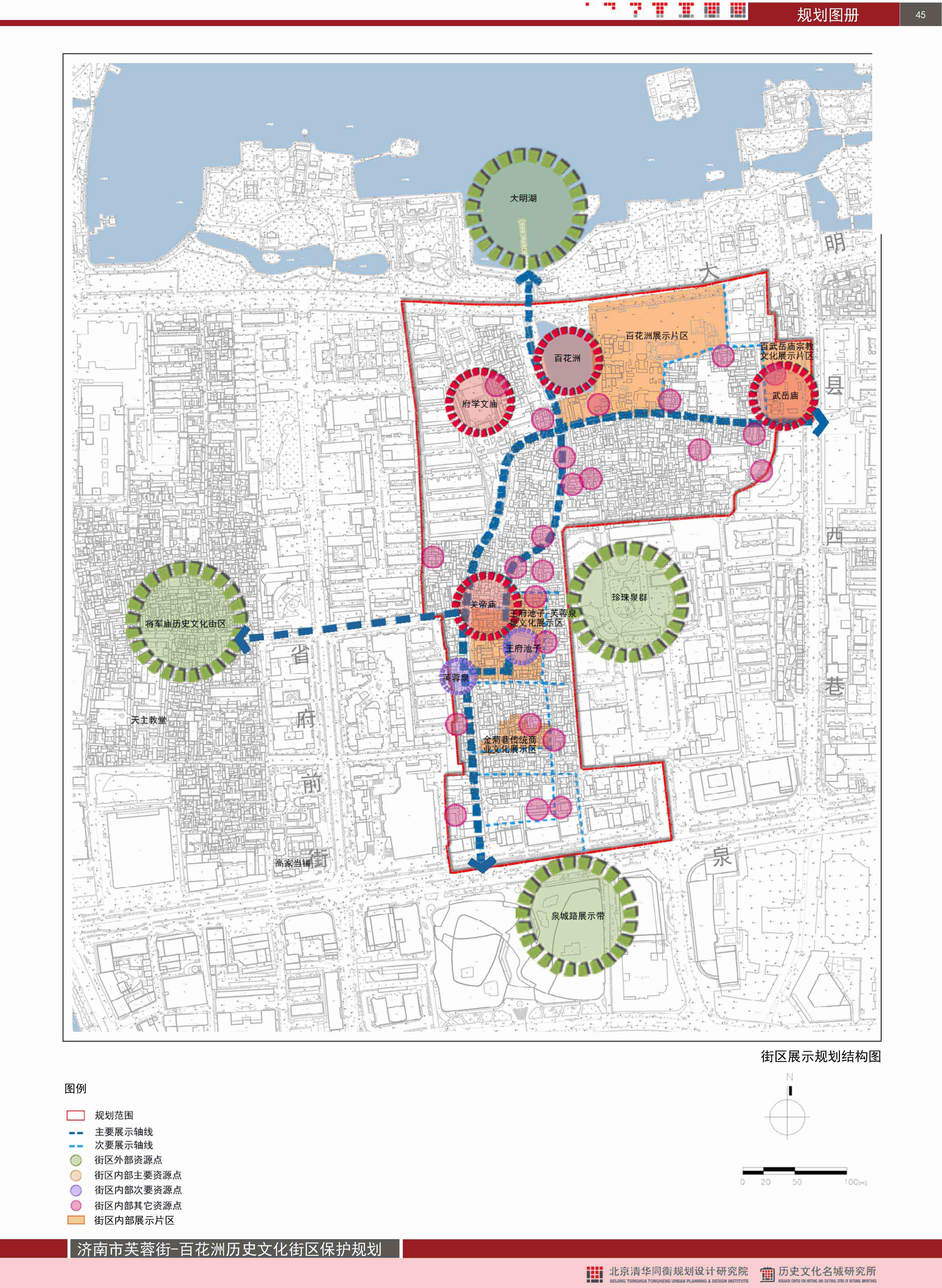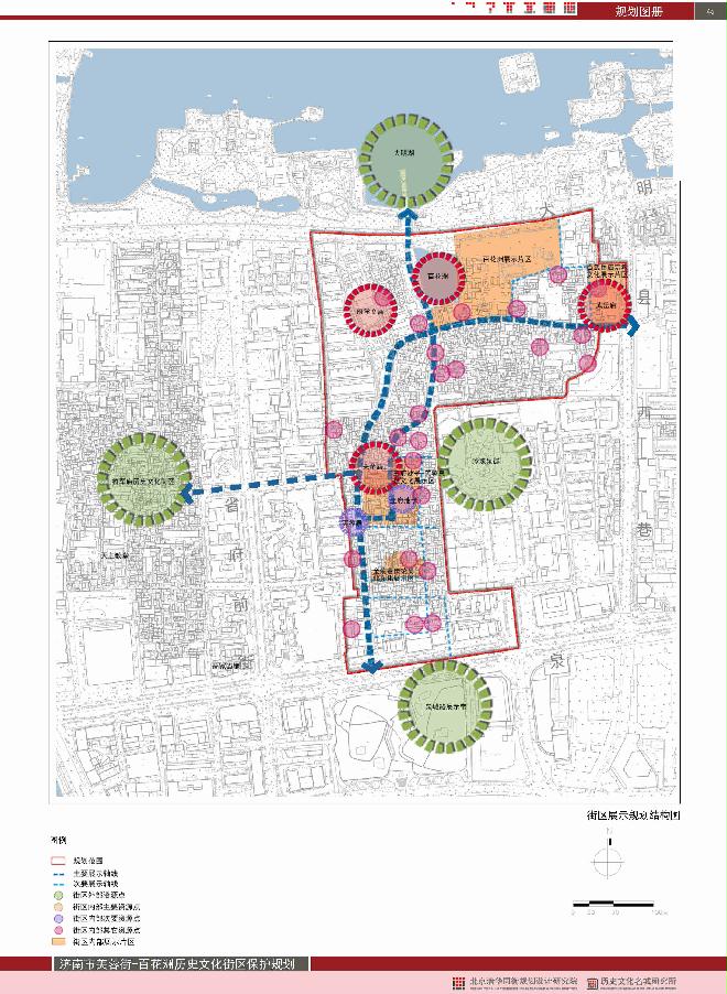 芙蓉街-百花洲历史文化街区文化展示格局在济南古城“一环、一湖、一横四纵、两区、四泉群”文化展示体系内,街区内部形成“三轴、四片、四节点”的展示结构,沿芙蓉街串联关帝庙、芙蓉泉等资源点形成的传统商业轴线;沿王府池子、曲水亭街串联大明湖、百花洲、王府池子等资源点形成的泉文化展示轴线;沿后宰门街串联百花洲、武岳庙等文化资源点形成的传统居住文化展示轴线。
