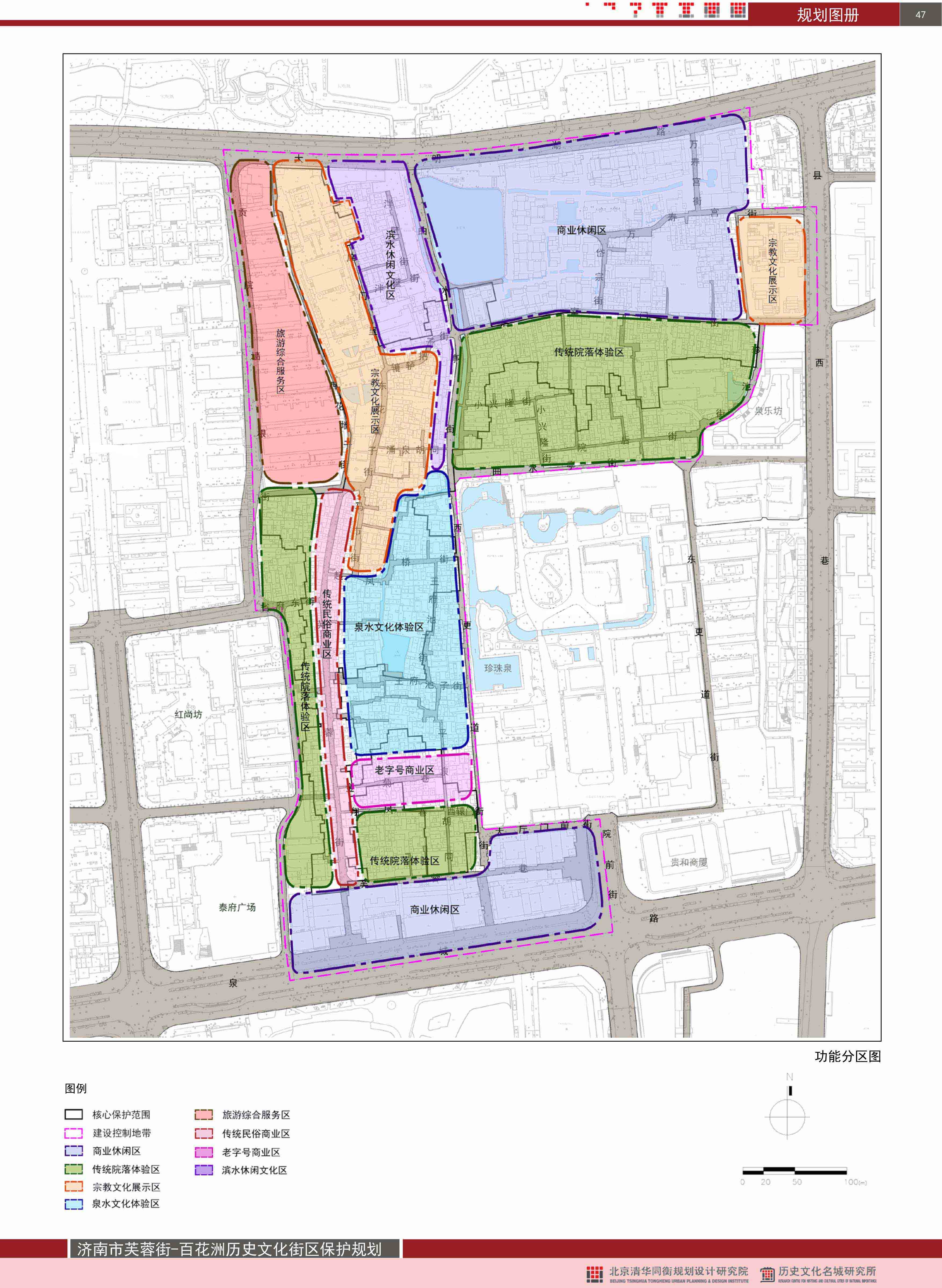 在保持街区居住功能为主的基础上,结合街区现状与资源特点将街区划分为八大功能片区,分别为商业休闲区、滨水休闲文化区、宗教文化展示区、泉水文化体验区、传统民俗商业区、老字号商业区、传统院落体验区、旅游综合服务区。