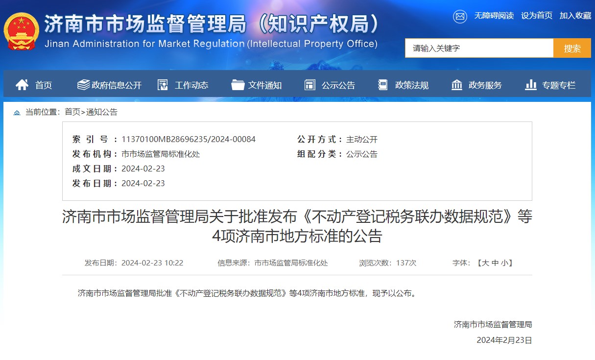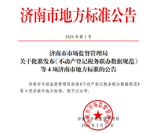 2024年2月23日,由济南市自然资源和规划局牵头组织,济南市不动产登记中心、济南市勘察测绘研究院等单位联合起草制定的《不动产登记税务联办数据接口规范》《不动产地籍调查数据规范》和《地上地下国有建设用地不动产地籍调查技术规范》三项地方标准由济南市市场监督管理局公告发布。